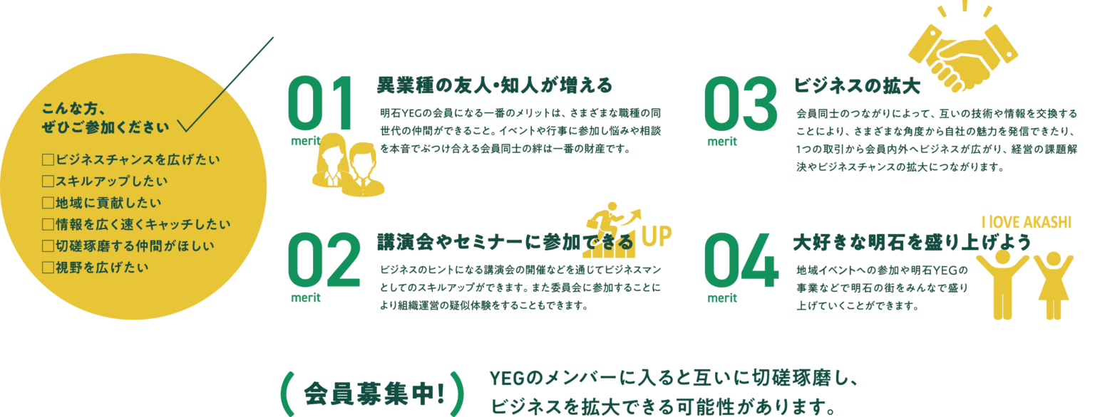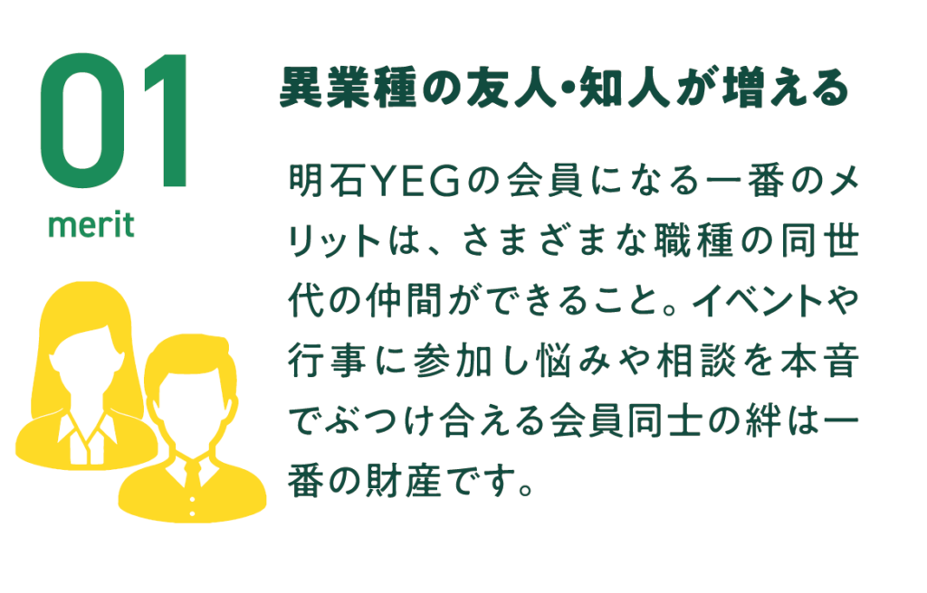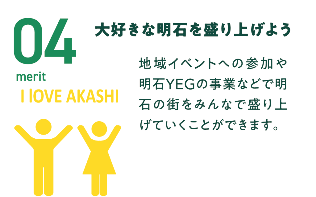 冒頭で振り返っていただいた「現在(イマ)、ここにいる理由」は何でしたか?それがあなたの周りの大切な人たちに伝われば、新たなご縁が生まれ、仲間が増えていくでしょう。そして、同期入会という横の繋がりも意識し、卒業後も長いお付き合いができるような関係性を築いていただけると考えます。そして、その先には会としてメンバーが増えることによりスケールメリットを活かした活動ができるのもYEGの素晴らしい点であるといえます。1人では、1社では到底叶わないことも、明石YEGとしてなら叶うこともあるはずです。単なる研鑽と交流の場で終わるのではなく、スケールメリットを活かせるような取り組みに繋げるためにも、多くの仲間が増えることは重要です。